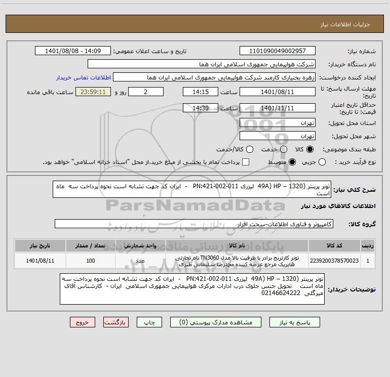 شرح کلی نیاز: تونر پرینتر (49A) HP – 1320 لیزری PN:421-002-011 - ایران کد جهت تشابه است نحوه پرداخت سه ماه است