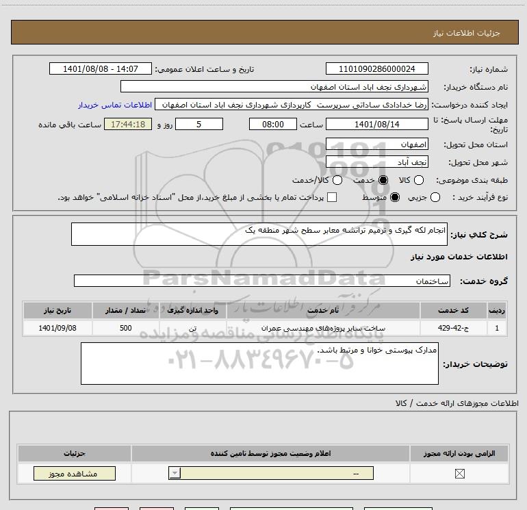 شرح کلی نیاز: انجام لکه گیری و ترمیم ترانشه معابر سطح شهر منطقه یک