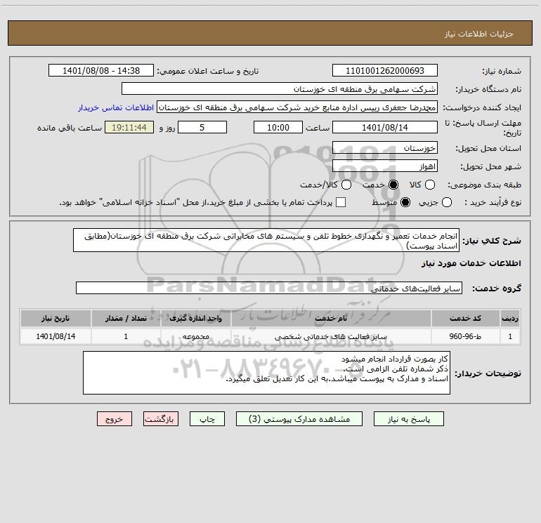 شرح کلی نیاز: انجام خدمات تعمیر و نگهداری خطوط تلفن و سیستم های مخابراتی شرکت برق منطقه ای خوزستان(مطابق اسناد پیوست)