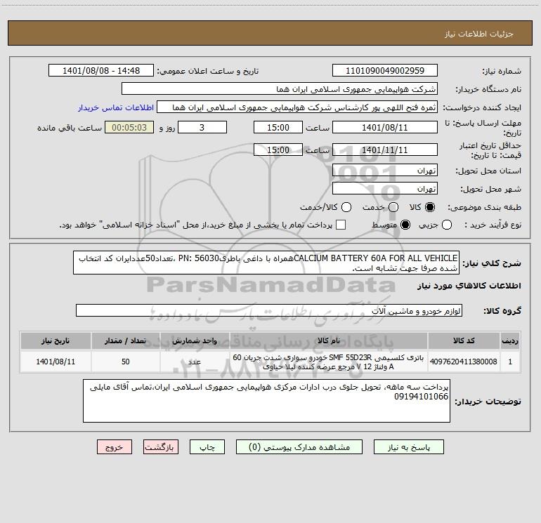 شرح کلی نیاز: CALCIUM BATTERY 60A FOR ALL VEHICLEهمراه با داغی باطریPN: 56030 ،تعداد50عددایران کد انتخاب شده صرفا جهت تشابه است.