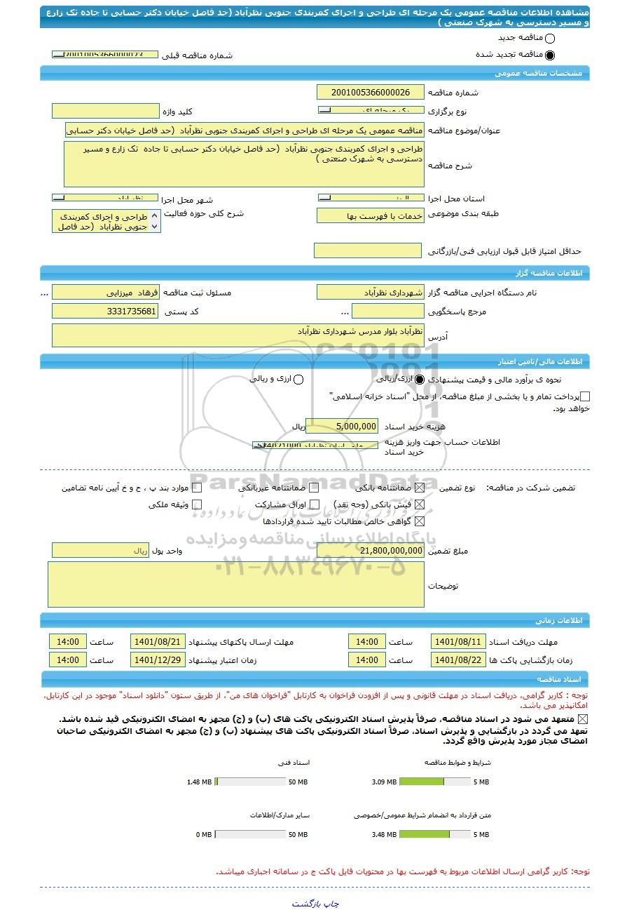 | نام دستگاه اجرایی مناقصه گزار | شهرداری نظرآباد | مسئول ثبت مناقصه | فرهاد میرزایی |