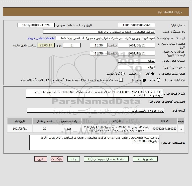 شرح کلی نیاز: CALCIUM BATTERY 150A FOR ALL VEHICLEهمراه با داغی باطری PN:N150L تعداد20عدد،ایران کد صرفاجهت تشابه است.