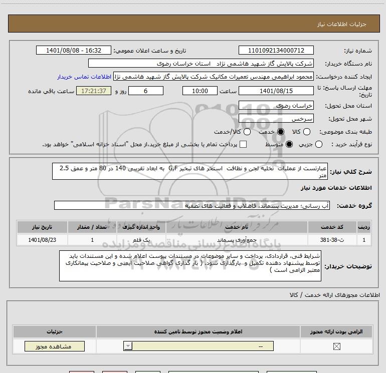 نام دستگاه خریدار:شرکت پالایش گاز شهید هاشمی نژاد استان خراسان رضوی