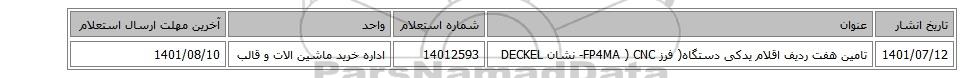 1401/07/12تامین هفت ردیف اقلام یدکی دستگاه( فرز FP4MA ) CNC- نشان DECKEL14012593اداره خرید ماشین الات و قالب1401/08/10