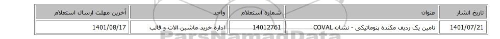 | 1401/07/21 | تامین یک ردیف مکنده پنوماتیکی - نشان COVAL | 14012761 | اداره خرید ماشین الات و قالب | 1401/08/17 |