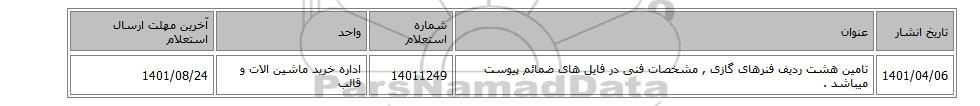 1401/04/06تامین هشت ردیف فنرهای گازی , مشخصات فنی در فایل های ضمائم پیوست میباشد .14011249اداره خرید ماشین الات و قالب1401/08/24