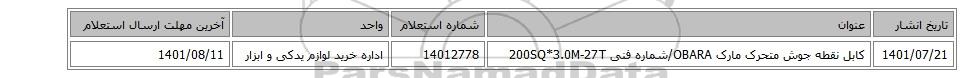 | 1401/07/21 | کابل نقطه جوش متحرک مارک OBARA/شماره فنی 200SQ*3.0M-27T | 14012778 | اداره خرید لوازم یدکی و ابزار | 1401/08/11 |