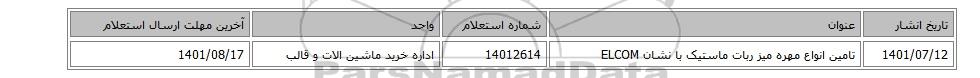 | 1401/07/12 | تامین انواع مهره میز ربات ماستیک با نشان ELCOM | 14012614 | اداره خرید ماشین الات و قالب | 1401/08/17 |