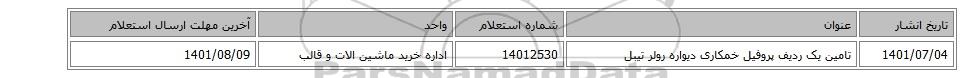 | 1401/07/04 | تامین یک ردیف پروفیل خمکاری دیواره رولر تیبل | 14012530 | اداره خرید ماشین الات و قالب | 1401/08/09 |