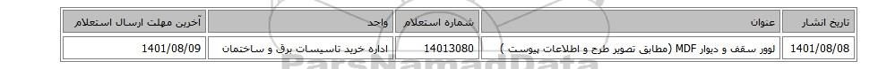 | 1401/08/08 | لوور سقف و دیوار MDF (مطابق تصویر طرح و اطلاعات پیوست ) | 14013080 | اداره خرید تاسیسات برق و ساختمان | 1401/08/09 |