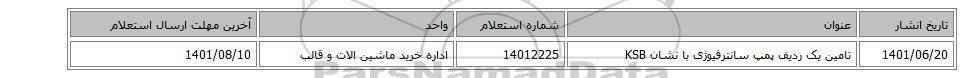 | 1401/06/20 | تامین یک ردیف پمپ سانترفیوژی با نشان KSB | 14012225 | اداره خرید ماشین الات و قالب | 1401/08/10 |