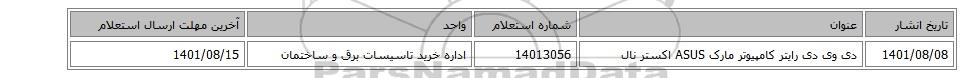 استعلام بها و موضوع استعلام دی وی دی رایتر کامپیوتر مارک ASUS اکستر نال به اطلاع کلیه شرکتها و افراد متخصص واجد شرایط میرساند، آگهی گذار در نظر دارد از طریق استعلام بها، نسبت به انتخاب و دریافت پیشنهادات اقدام نماید. این استعلام با کد آگهی ثبت شده در سامانه خبرگزاری پارس نماد : 5088060 منتشر شده است. مشخصات استعلام : تاریخ شروع استعلام: 1401/08/09 آخرین مهلت ارسال پیشنهاد قیمت : 1401/08/15 و محل اجرای پروژه : استان تهران میباشد. استعلام قیمت مورد درخواست : دی وی دی رایتر کامپیوتر مارک ASUS اکستر نال با دستهبندیهای تخصصی و گروه های مرتبط : کامپیوتر, استعلام اطلاع رسانی میگردد.