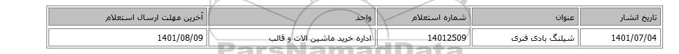 | 1401/07/04 | شیلنگ بادی فنری | 14012509 | اداره خرید ماشین الات و قالب | 1401/08/09 |