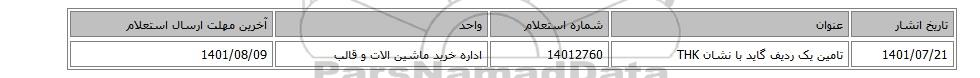 | 1401/07/21 | تامین یک ردیف گاید با نشان THK | 14012760 | اداره خرید ماشین الات و قالب | 1401/08/09 |