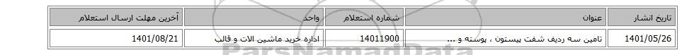 1401/05/26تامین سه ردیف شفت پیستون ، پوسته و ...14011900اداره خرید ماشین الات و قالب1401/08/21