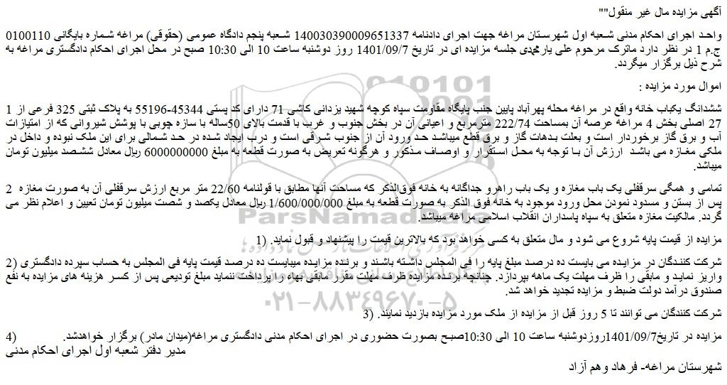 4) مزایده در تاریخ1401/09/7روزدوشنبه ساعت 10 الی 10:30صبح بصورت حضوری در اجرای احکام مدنی دادگستری مراغه(میدان مادر) برگزار خواهدشد. مدیر دفتر شعبه اول اجرای احکام مدنی شهرستان مراغه- فرهاد وهم آزاد
