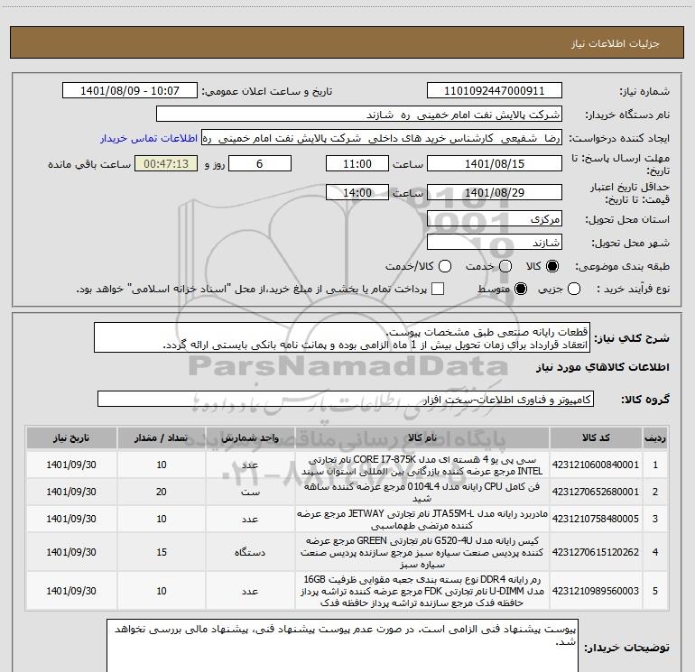 شرح کلی نیاز: قطعات رایانه صنتعی طبق مشخصات پیوست. انعقاد قرارداد برای زمان تحویل بیش از 1 ماه الزامی بوده و پمانت نامه بانکی بایستی ارائه گردد.