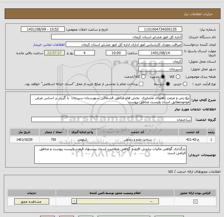 شرح کلی نیاز: تیغ زنی و مرمت راههای عشایری بخش هاو مناطق قشلاقی شهرستان سیرجان با گریدر بر اساس عرض موجودمطابق اسناد ولیست مناطق پیوست