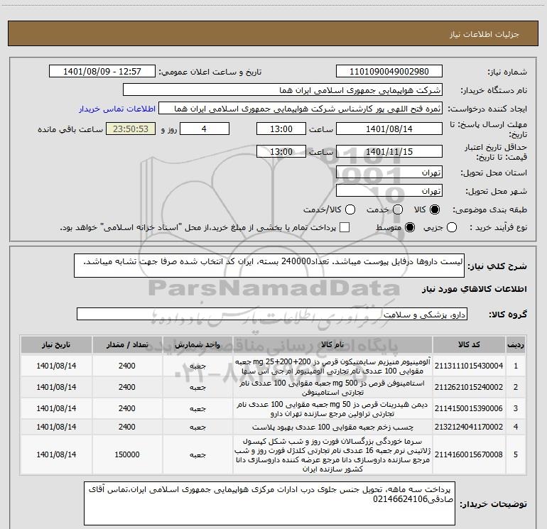 شرح کلی نیاز: لیست داروها درفایل پیوست میباشد. تعداد240000 بسته، ایران کد انتخاب شده صرفا جهت تشابه میباشد.