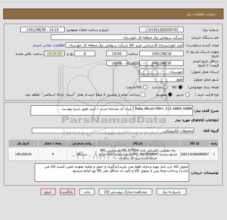 شرح کلی نیاز: Relay Micom P841 31S A6M0 G98M / ایران کد مشابه است / خرید طبق شرح پیوست