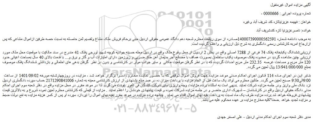 به موجب دادنامه شماره 140007390000562591صادره از سوی ریاست محترم شعبه دهم دادگاه عمومی حقوقی اردبیل مبنی برحکم فروش ملک مشاع وتقسیم ثمن حاصله به نسبت حصه طرفین ازاموال مشاعی که پس ازارجاع امربه کارشناس رسمی دادگستری به شرح ذیل ارزیابی و واعلام گردیده است.