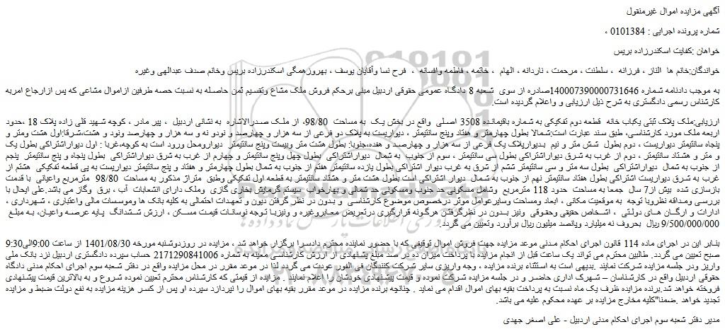 به موجب دادنامه شماره 140007390000731646صادره از سوی  شعبه 8 دادگاه عمومی حقوقی اردبیل مبنی برحکم فروش ملک مشاع وتقسیم ثمن حاصله به نسبت حصه طرفین ازاموال مشاعی که پس ازارجاع امربه کارشناس رسمی دادگستری به شرح ذیل ارزیابی و واعلام گردیده است.