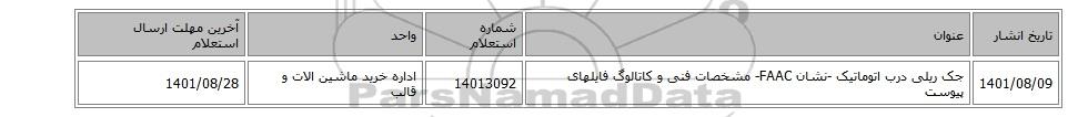| 1401/08/09 | جک ریلی درب اتوماتیک -نشان FAAC- مشخصات فنی و کاتالوگ فایلهای پیوست | 14013092 | اداره خرید ماشین الات و قالب | 1401/08/28 |