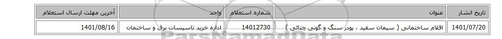 1401/07/20اقلام ساختمانی ( سیمان سفید ، پودر سنگ و گونی چتائی )14012730اداره خرید تاسیسات برق و ساختمان1401/08/16