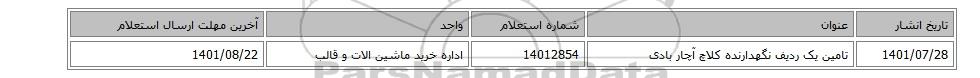 | 1401/07/28 | تامین یک ردیف نگهدارنده کلاچ آچار بادی | 14012854 | اداره خرید ماشین الات و قالب | 1401/08/22 |