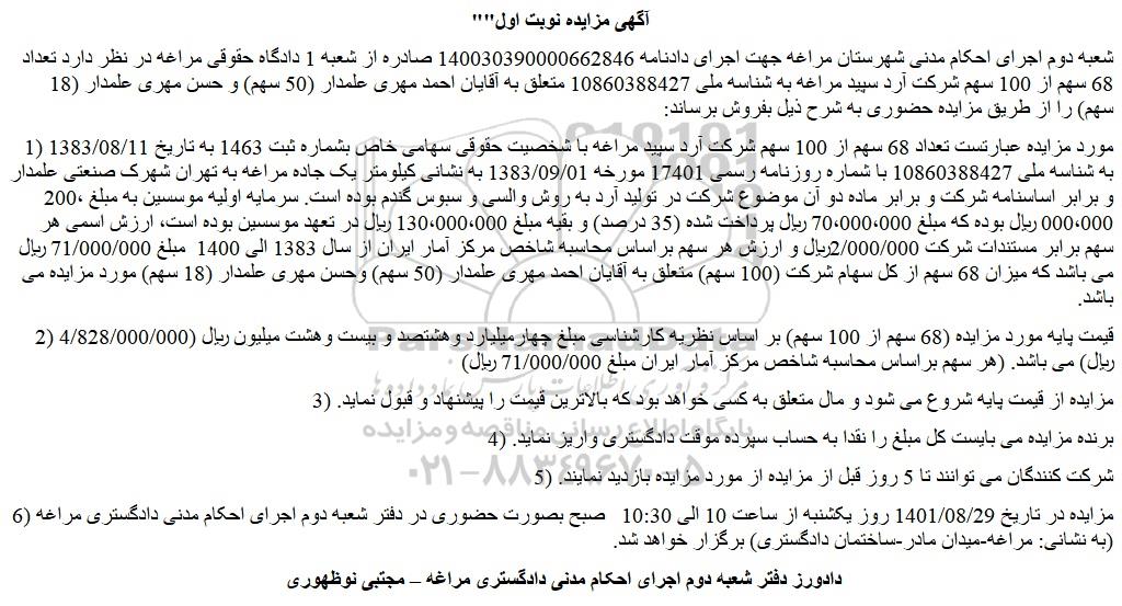 شعبه دوم اجرای احکام مدنی شهرستان مراغه جهت اجرای دادنامه 140030390000662846 صادره از شعبه 1 دادگاه حقوقی مراغه در نظر دارد تعداد 68 سهم از 100 سهم شرکت آرد سپید مراغه به شناسه ملی 10860388427 متعلق به آقایان احمد مهری علمدار (50 سهم) و حسن مهری علمدار (18 سهم) را از طریق مزایده حضوری به شرح ذیل بفروش برساند: