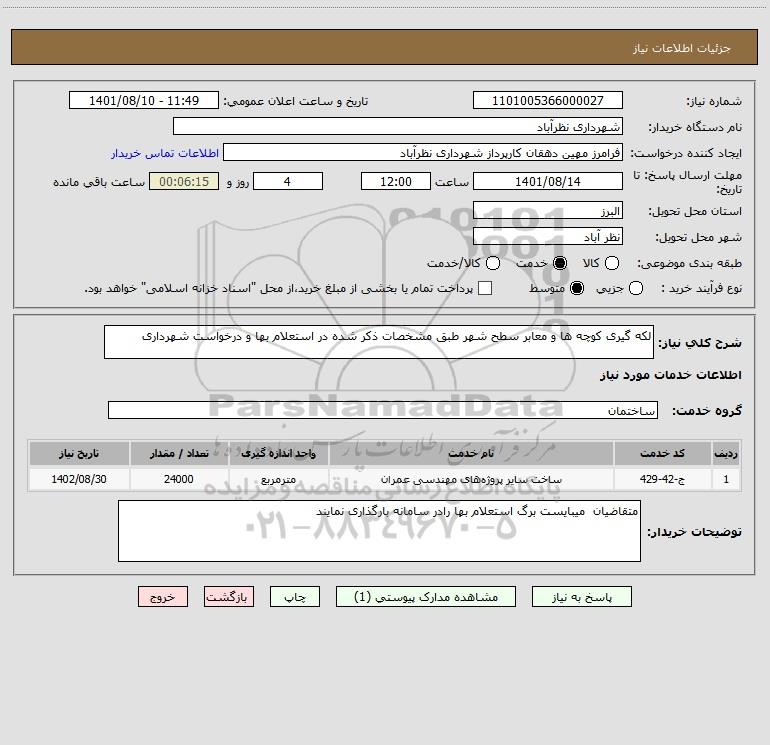 شرح کلی نیاز: لکه گیری کوچه ها و معابر سطح شهر طبق مشخصات ذکر شده در استعلام بها و درخواست شهرداری