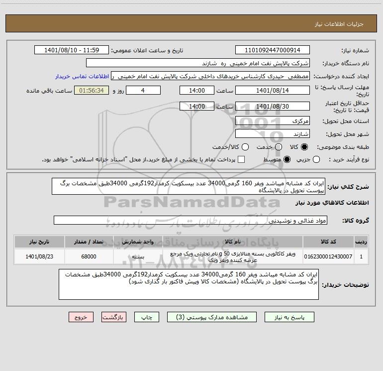 استعلام ایران کد مشابه میباشد ویفر 160 گرمی34000 عدد بیسکویت کرمدار192گرمی 34000طبق مشخصات برگ پیوست تحویل در پالایشگاه, استعلام ایران کد مشابه میباشد ویفر 160 گرمی34000 عدد بیسکویت کرمدار192گرمی 34000طبق مشخصات برگ پیوست تحویل در پالایشگاه