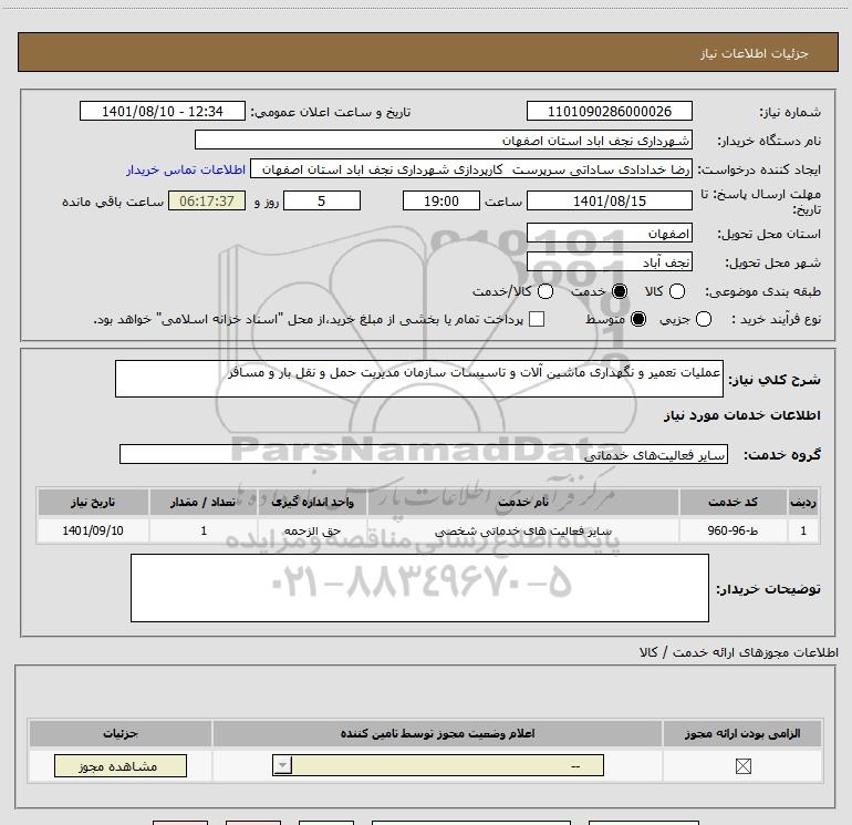 شرح کلی نیاز: عملیات تعمیر و نگهداری ماشین آلات و تاسیسات سازمان مدیریت حمل و نقل بار و مسافر