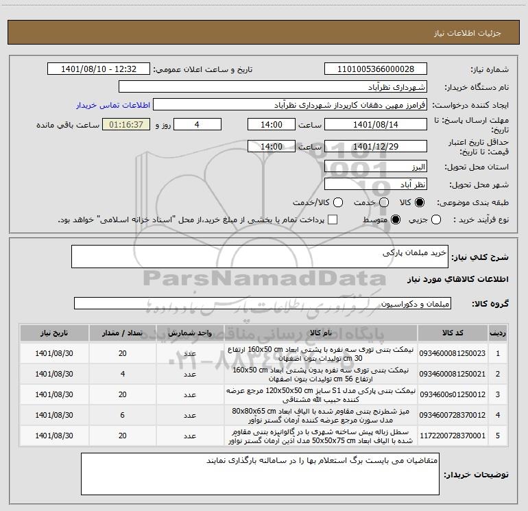 | 3 | 0934600s01250012 | نیمکت بتنی پارکی مدل S1 سایز 120x50x50 cm مرجع عرضه کننده حبیب الله مشتاقی | عدد | 20 | 1401/08/30 |