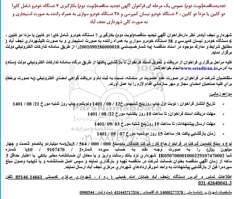 شهرداری نجف آباد در نظر داردفراخوان آگهی تجدید مناقصه(نوبت دوم) بكارگیری 7 دستگاه خودرو شامل كاپرا دو كابین یا مزدا دو كابین ، 6 دستگاه خودرو نیسان كمپرسی و 38 دستگاه خودرو سواری به همراه راننده به صورت استیجاری و به صورت كلیشهرداری نجف آباد ( مطابق شرایط و مدارك موجود در اسناد مناقصه )به شمارهسیستمی 2001090286000018را از طریق سامانه تداركات الكترونیكی دولت برگزار نماید.