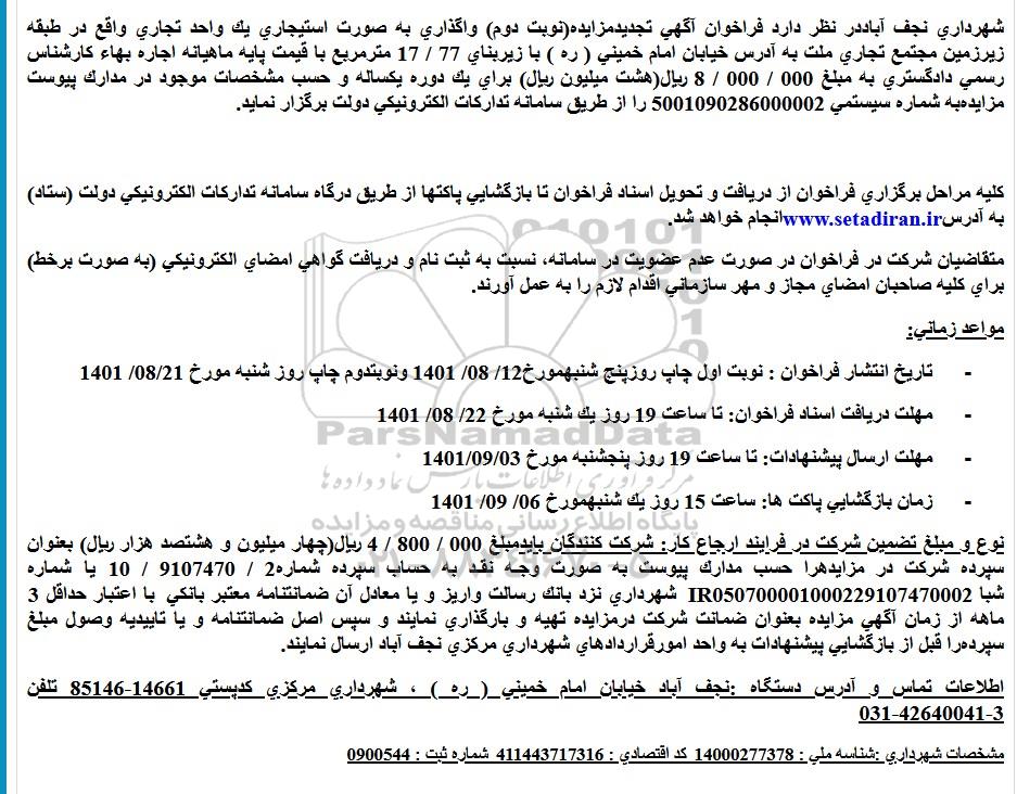 شهرداری نجف آباد در نظر دارد فراخوان آگهی تجدید مزایده(نوبت دوم) واگذاری به صورت استیجاری یک واحد تجاری واقع در طبقه زیرزمین مجتمع تجاری ملت به آدرس خیابان امام خمینی ( ره ) با زیربنای 77 . 17 مترمربع با قیمت پایه ماهیانه اجاره بهاء كارشناس رسمی دادگستری به مبلغ 000 . 000 . 8 ریال(هشت میلیون ریال) برای یك دوره یكساله و حسب مشخصات موجود در مدارك پیوست مزایدهبه شماره سیستمی 5001090286000002 را از طریق سامانه تداركات الكترونیكی دولت برگزار نماید.