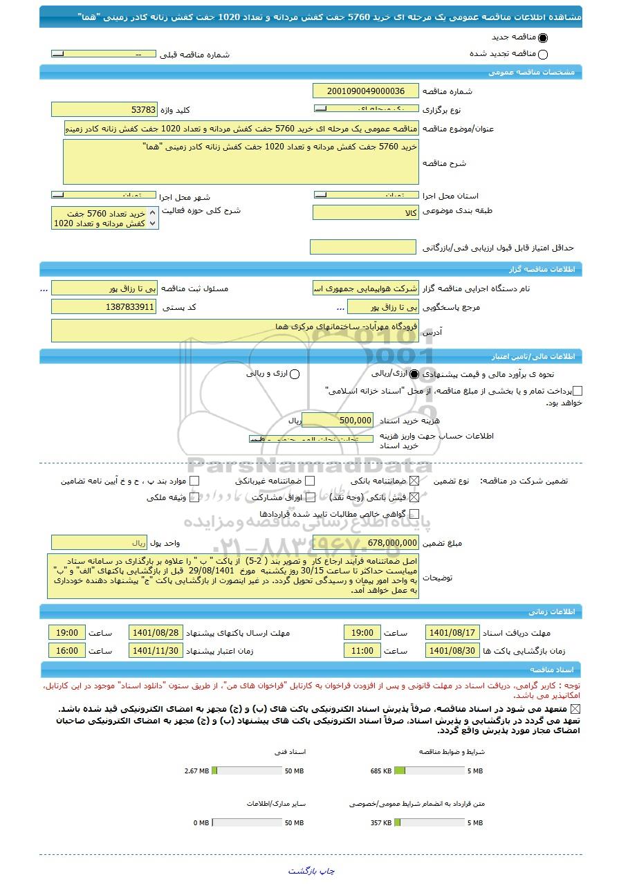 | شرح مناقصه | خرید 5760 جفت کفش مردانه و تعداد 1020 جفت کفش زنانه کادر زمینی "هما" | ||