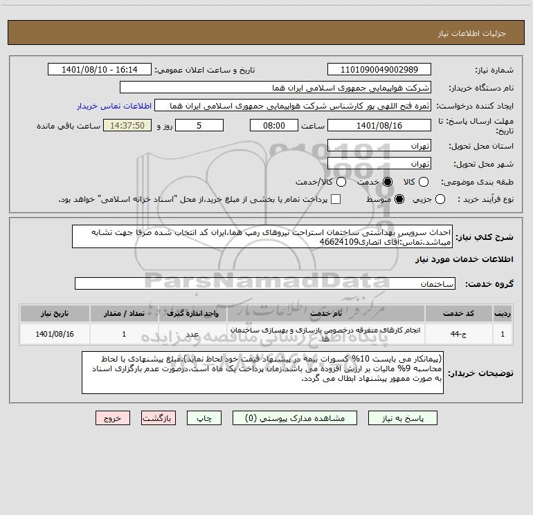 شرح کلی نیاز: احداث سرویس بهداشتی ساختمان استراحت نیروهای رمپ هما،ایران کد انتخاب شده صرفا جهت تشابه میباشد.تماس:آقای انصاری46624109