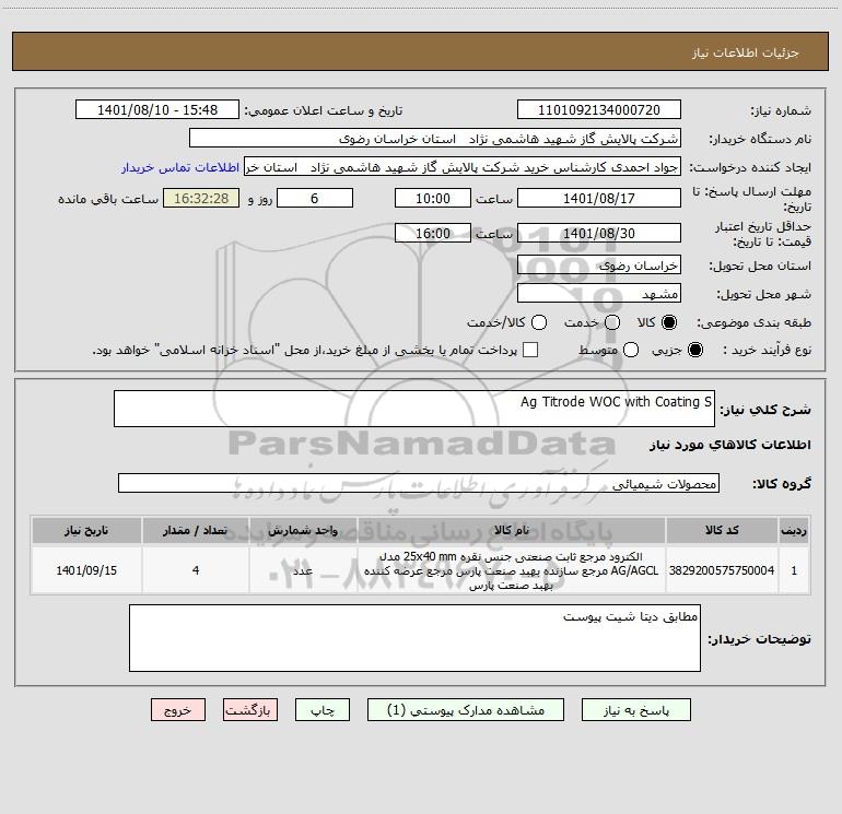 شرح کلی نیاز: Ag Titrode WOC with Coating S