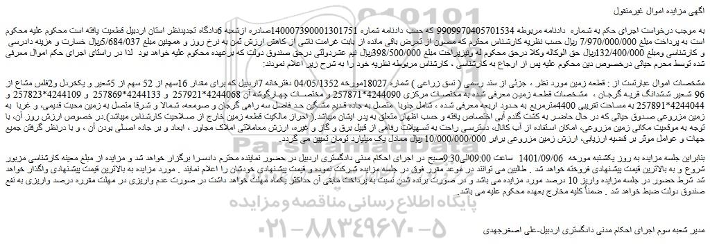 بنابراین جلسه مزایده به روز یکشنبه مورخه  1401/09/06  ساعت 09:00الی9:30صبح در اجرای احکام مدنی دادگستری اردبیل در حضور نماینده محترم دادسرا برگزار خواهد شد و مزایده از مبلغ معینه کارشناسی مزبور شروع و به بالاترین قیمت پیشنهادی فروخته خواهد شد . طالبین می توانند در موعد مقرر فوق در جلسه مزایده شرکت نموده و قیمت پیشنهادی خودشان را اعلام نمایند . مورد مزایده به بالاترین قیمت پیشنهادی واگذار خواهد شد شرط حضور در جلسه مزایده واریز 10 درصد مورد مزایده می باشد و در صورت برنده شدن نسبت به پرداخت مابقی آن حداکثر یکماه مهلت خواهد داشت در صورت عدم واریزی در مهلت مقرره درصد واریزی به نفع صندوق دولت ضبط خواهد شد . ضمناً کلیه مخارج بعهده محکوم علیه می باشد.