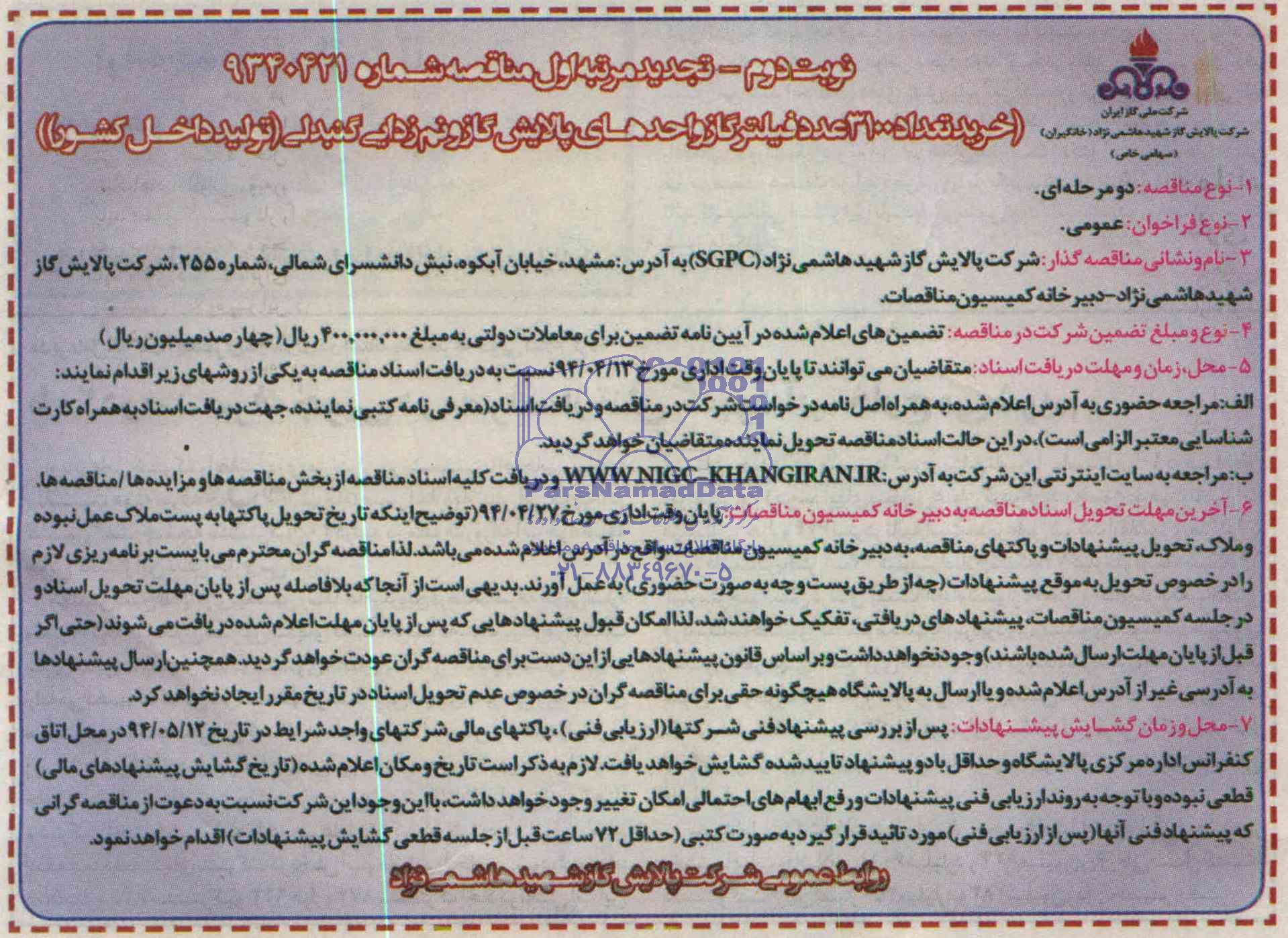 3- نام و نشانی مناقصه گذار: شرکت پالایش گاز شهید هاشمی نژاد SGPC به آدرس: مشهد ، خیابان آبکوه ، نبش دانشسرای شمالی، شمراه 255 شرکت پالایش گاز شهید هاشمی نژاد ، دبیرخانه کمیسیون مناقصات.
