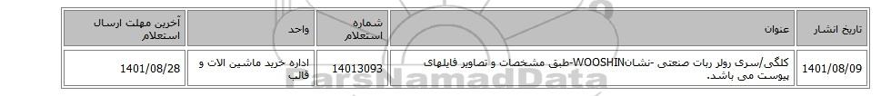 | 1401/08/09 | کلگی/سری رولر ربات صنعتی -نشانWOOSHIN-طبق مشخصات و تصاویر فایلهای پیوست می باشد. | 14013093 | اداره خرید ماشین الات و قالب | 1401/08/28 |