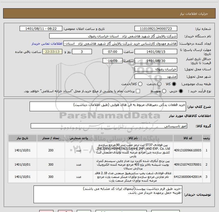 نام دستگاه خریدار:شرکت پالایش گاز شهید هاشمی نژاد استان خراسان رضوی