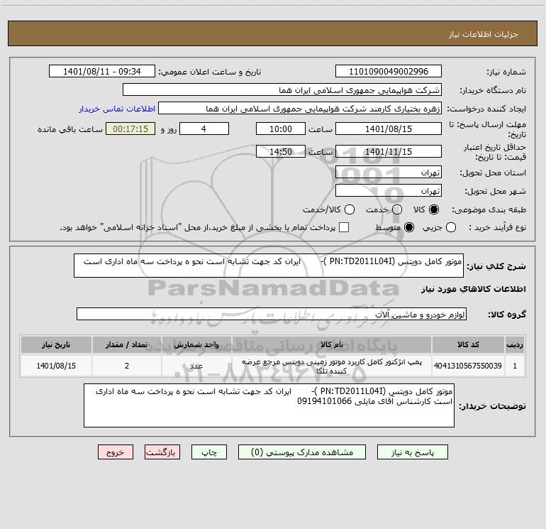 شرح کلی نیاز: موتور کامل دویتس (PN:TD2011L04I )- ایران کد جهت تشابه است نحو ه پرداخت سه ماه اداری است