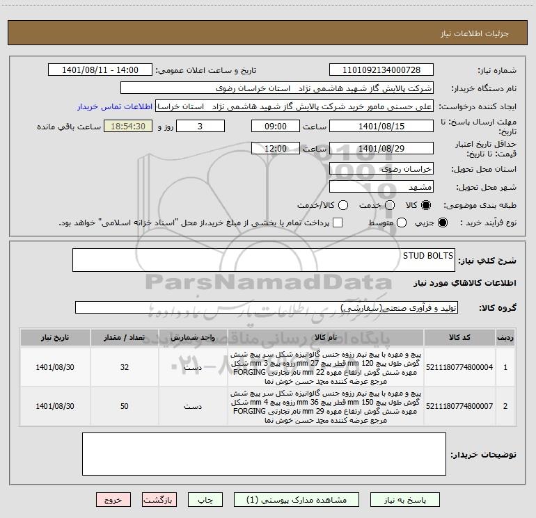 نام دستگاه خریدار:شرکت پالایش گاز شهید هاشمی نژاد استان خراسان رضوی