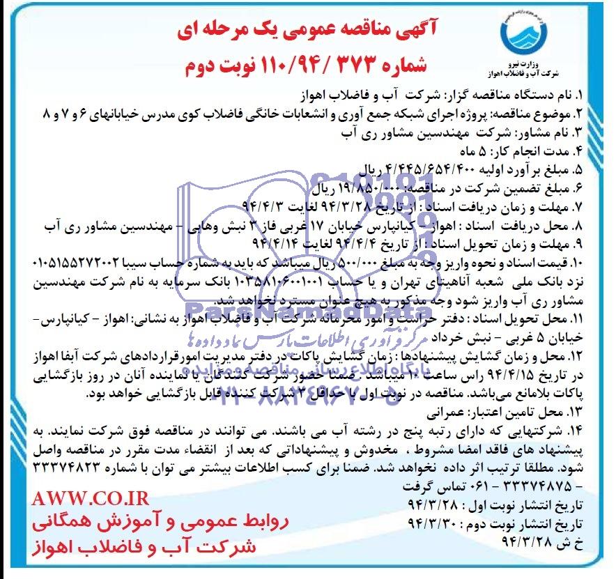 محل و زمان گشایش پیشنهادها: زمان گشایش پاکات در دفتر مدیریت قراردادهای شرکت آبفای اهواز در تاریخ 94.04.15 رأس ساعت 10 می باشد. ضمناً حضور شرکت کنندگان یا نماینده آنان در روز بازگشایی پاکات بلامانع می باشد. مناقصه در نوبت اول حداقل 3 شرکت کننده قابل بازگشایی خواهد بود