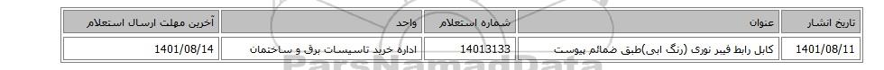 | 1401/08/11 | کابل رابط فیبر نوری (رنگ ابی)طبق ضمائم پیوست | 14013133 | اداره خرید تاسیسات برق و ساختمان | 1401/08/14 |