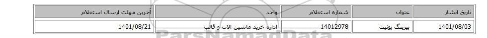 | 1401/08/03 | بیرینگ یونیت | 14012978 | اداره خرید ماشین الات و قالب | 1401/08/21 |