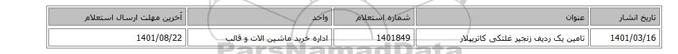| 1401/03/16 | تامین یک ردیف زنجیر غلتکی کاتریپلار | 1401849 | اداره خرید ماشین الات و قالب | 1401/08/22 |