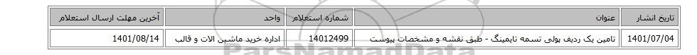 | 1401/07/04 | تامین یک ردیف پولی تسمه تایمینگ - طبق نقشه و مشخصات پیوست | 14012499 | اداره خرید ماشین الات و قالب | 1401/08/14 |
